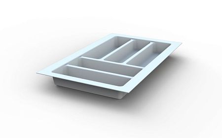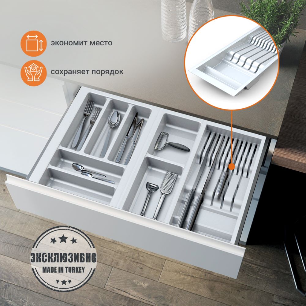 • Насечки по периметру изделия для ровного обрезания ширины и глубины лотков под размер кухонного ящика.