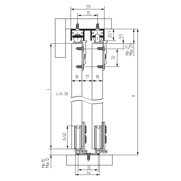 Система с нижним несущим механизмом для дверей весом до 80 кг. Комплект на одну дверь включает два нижних ролика на подшипниках с полиамидным покрытием, два верхних направляющих ролика с полиамидным покрытием и два верхних стопора. В данном комплекте уже в наличии комплектующие на 2 двери.